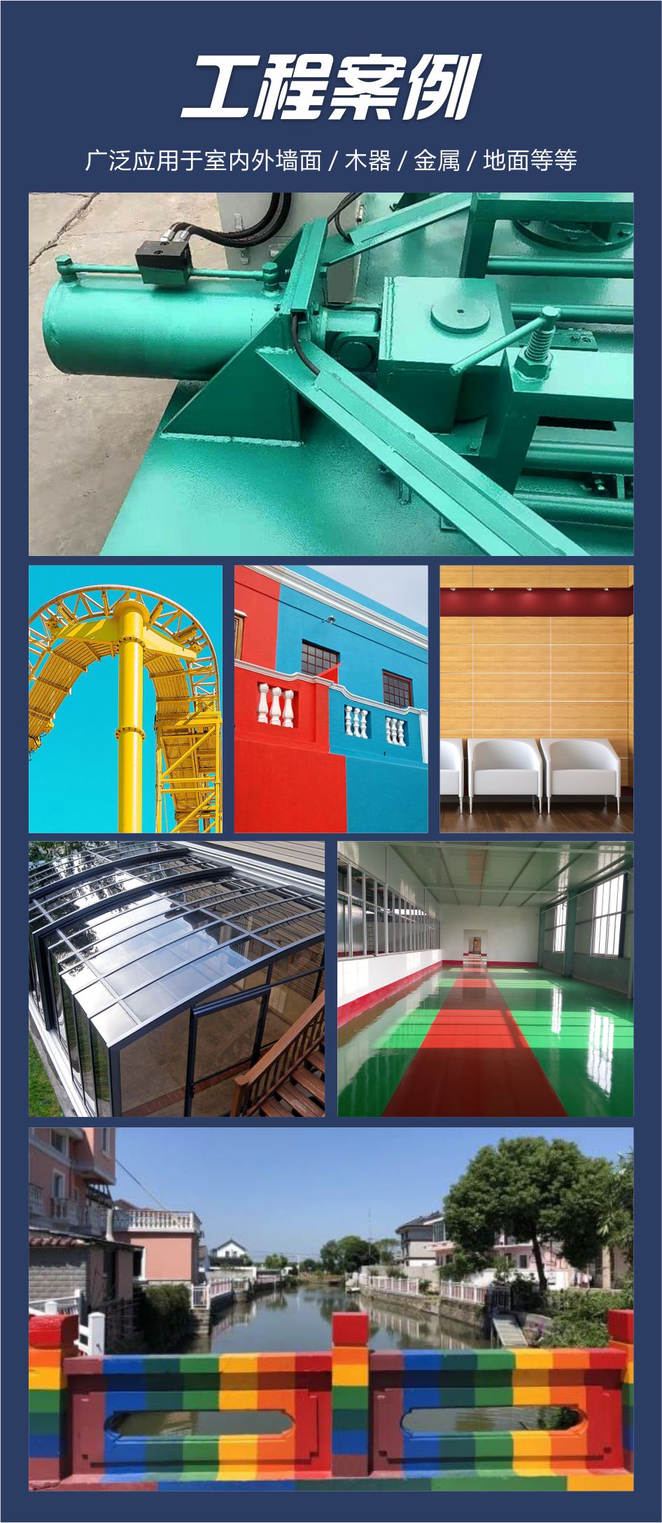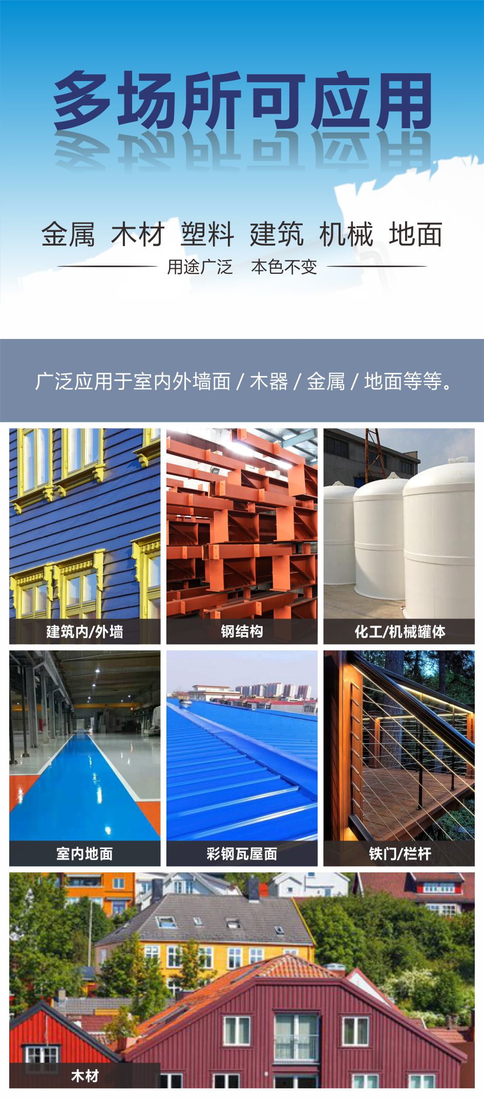 適用于金屬屋面及鋼結(jié)構(gòu)、橋梁、木材、建筑表面、船舶、護欄、鐵門、鐵板等表面的防銹罩面保護和翻新。
